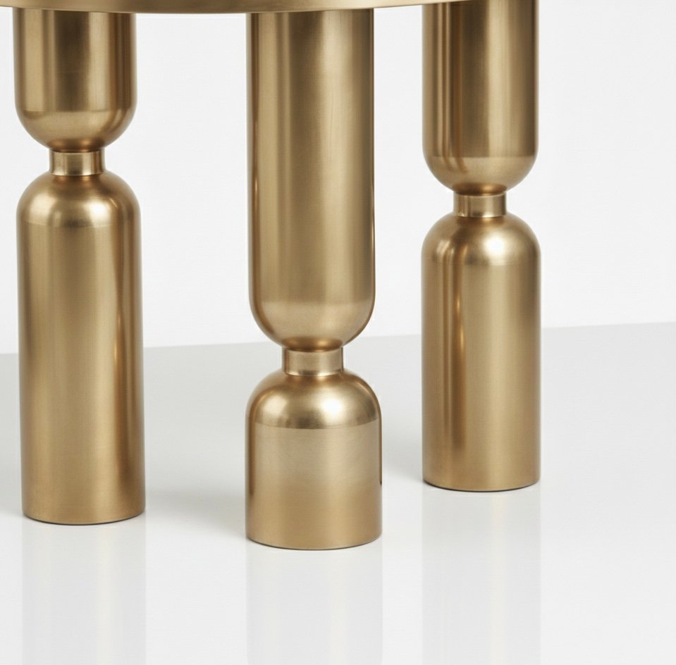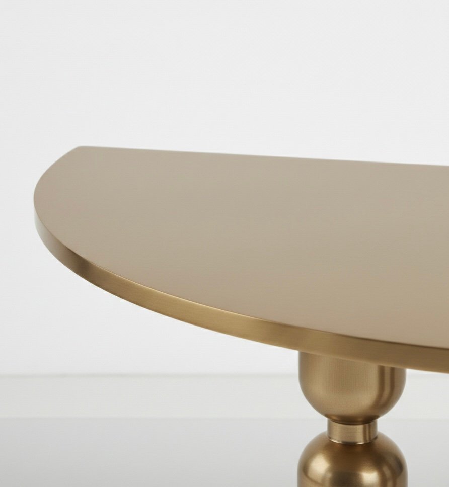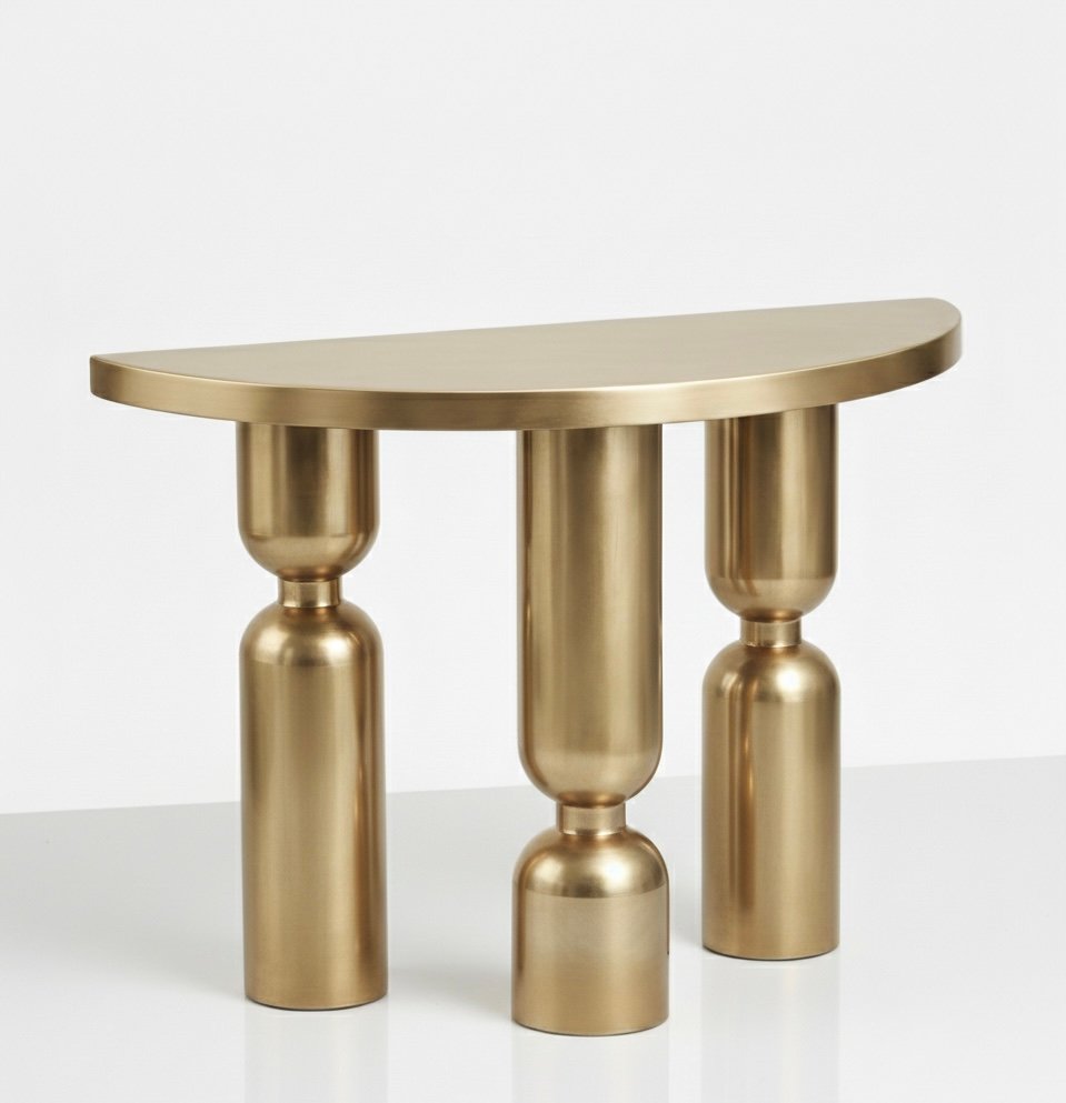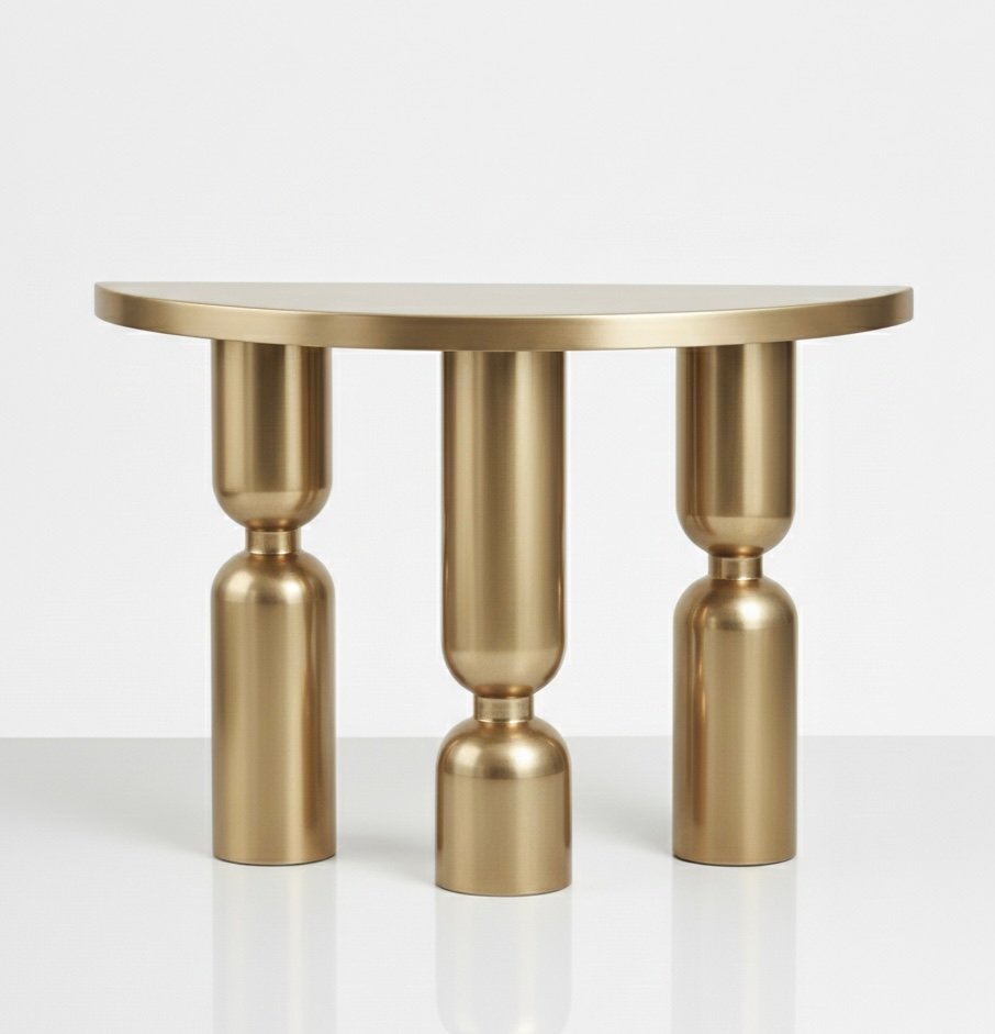 Sculptural console table defined by its architectural silhouette and bold pedestal leg design. The curved top and structured base create a balanced composition that functions as both a practical surface and a statement design piece.