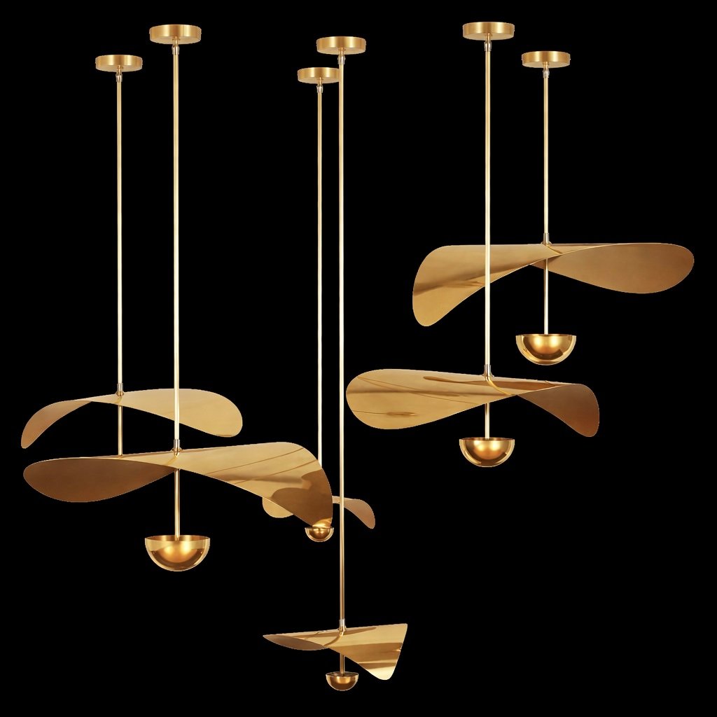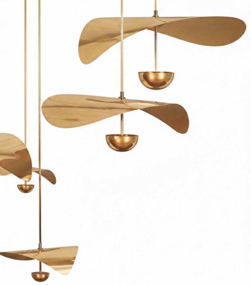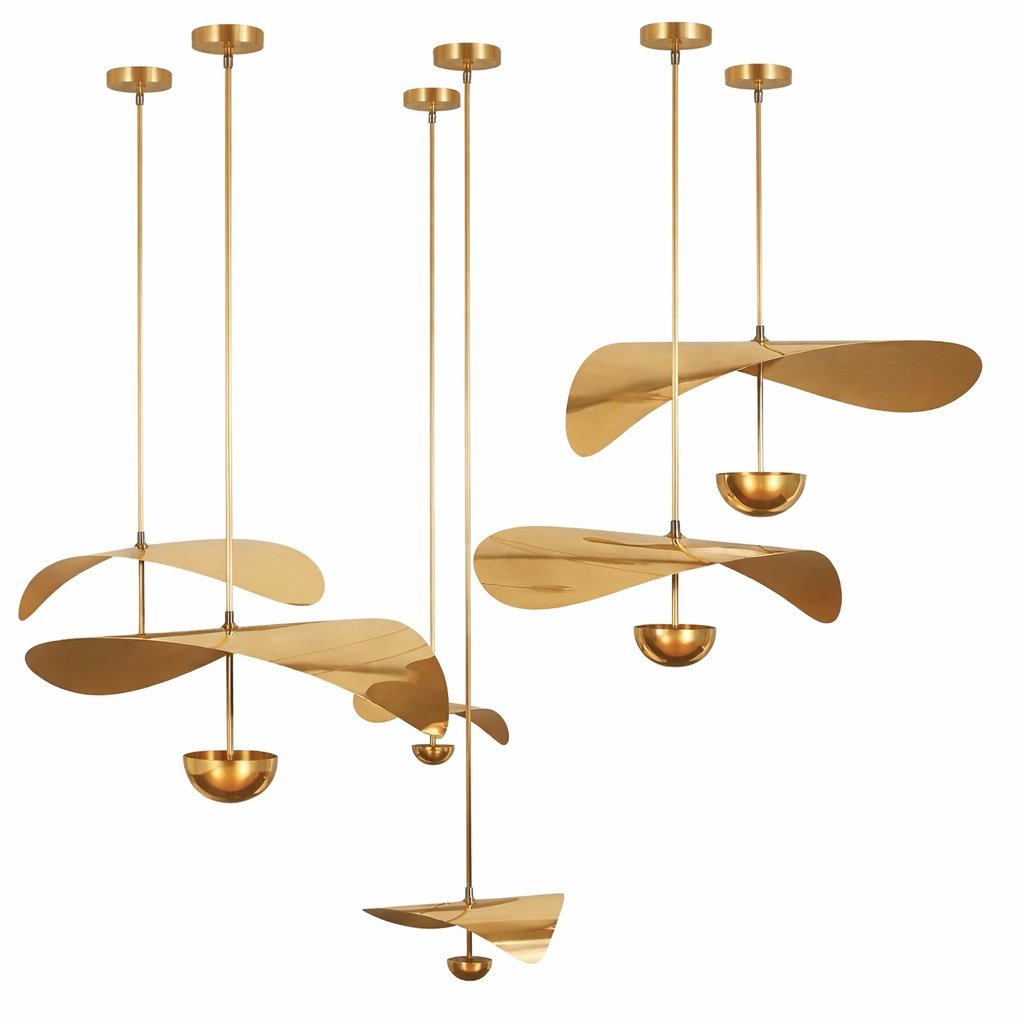 Inspired by the delicate form of blooming petals, this sculptural suspension set explores organic movement through refined brass craftsmanship. Each element is individually shaped, formed, and hand-finished from solid brass, creating a soft floral silhouette suspended in space.