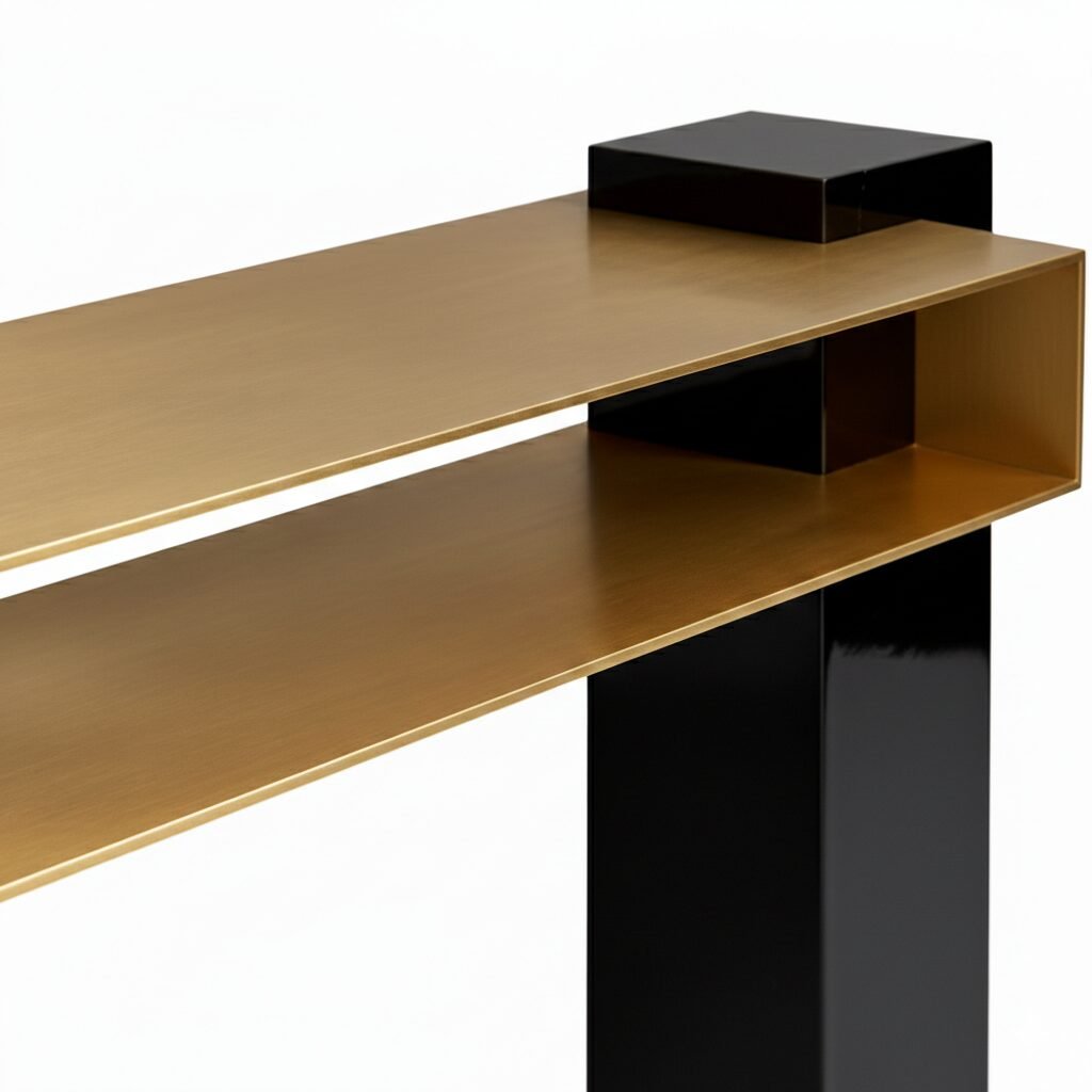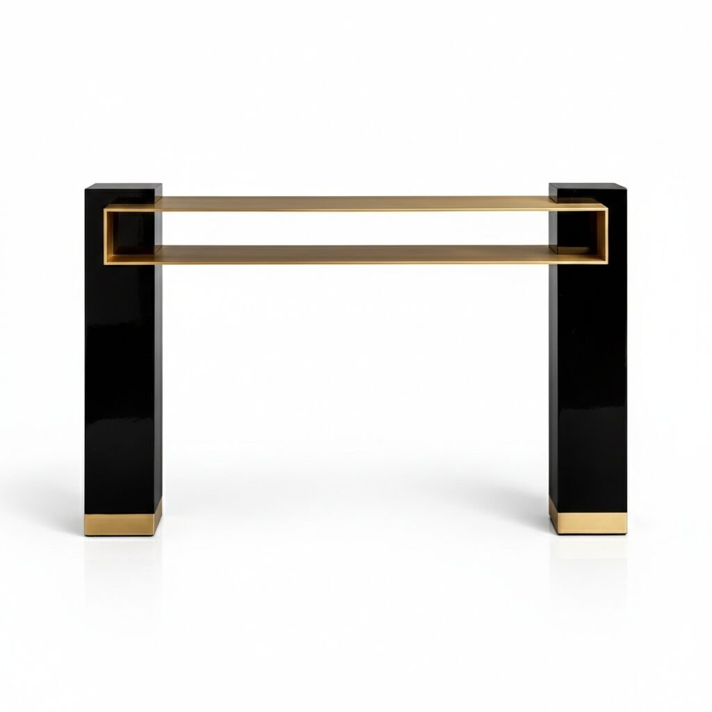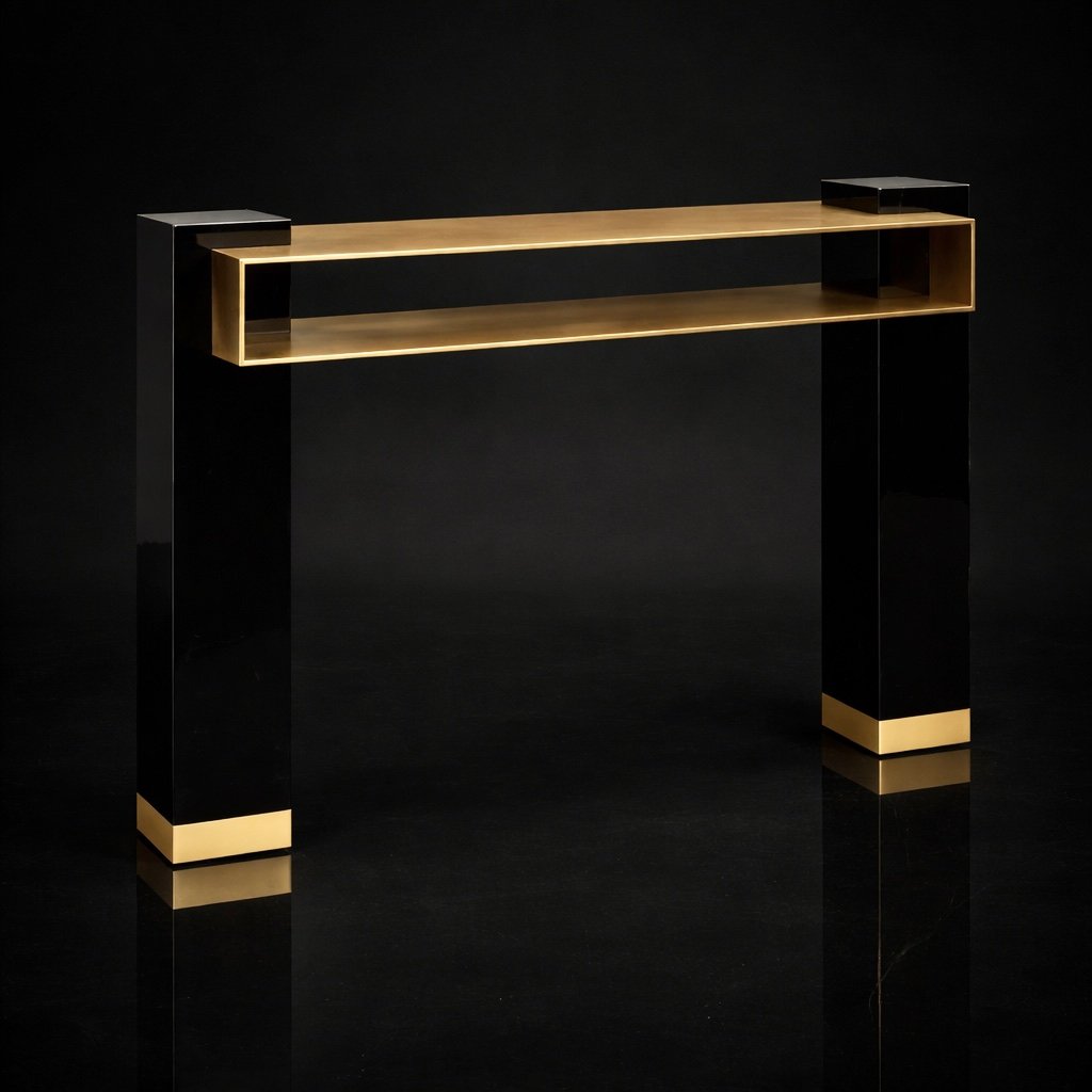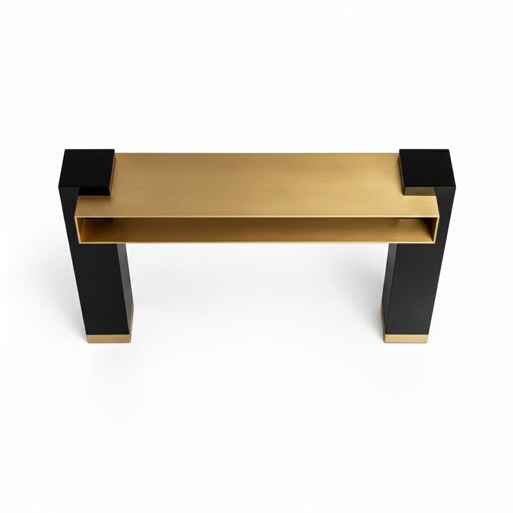 Contemporary console table handcrafted in brass, defined by its refined linear composition and balanced proportions. The tabletop and lower base are crafted in solid brass, ensuring strength, weight stability, and long-term durability.