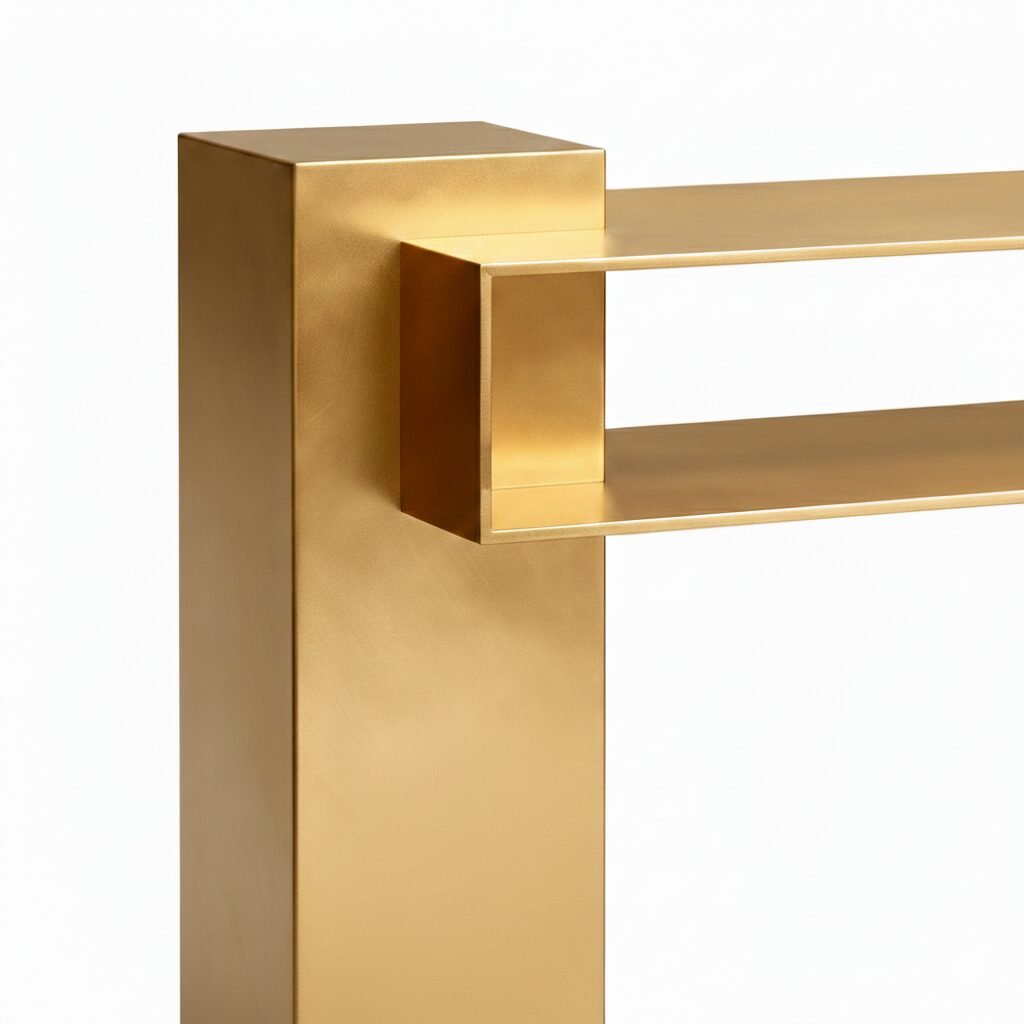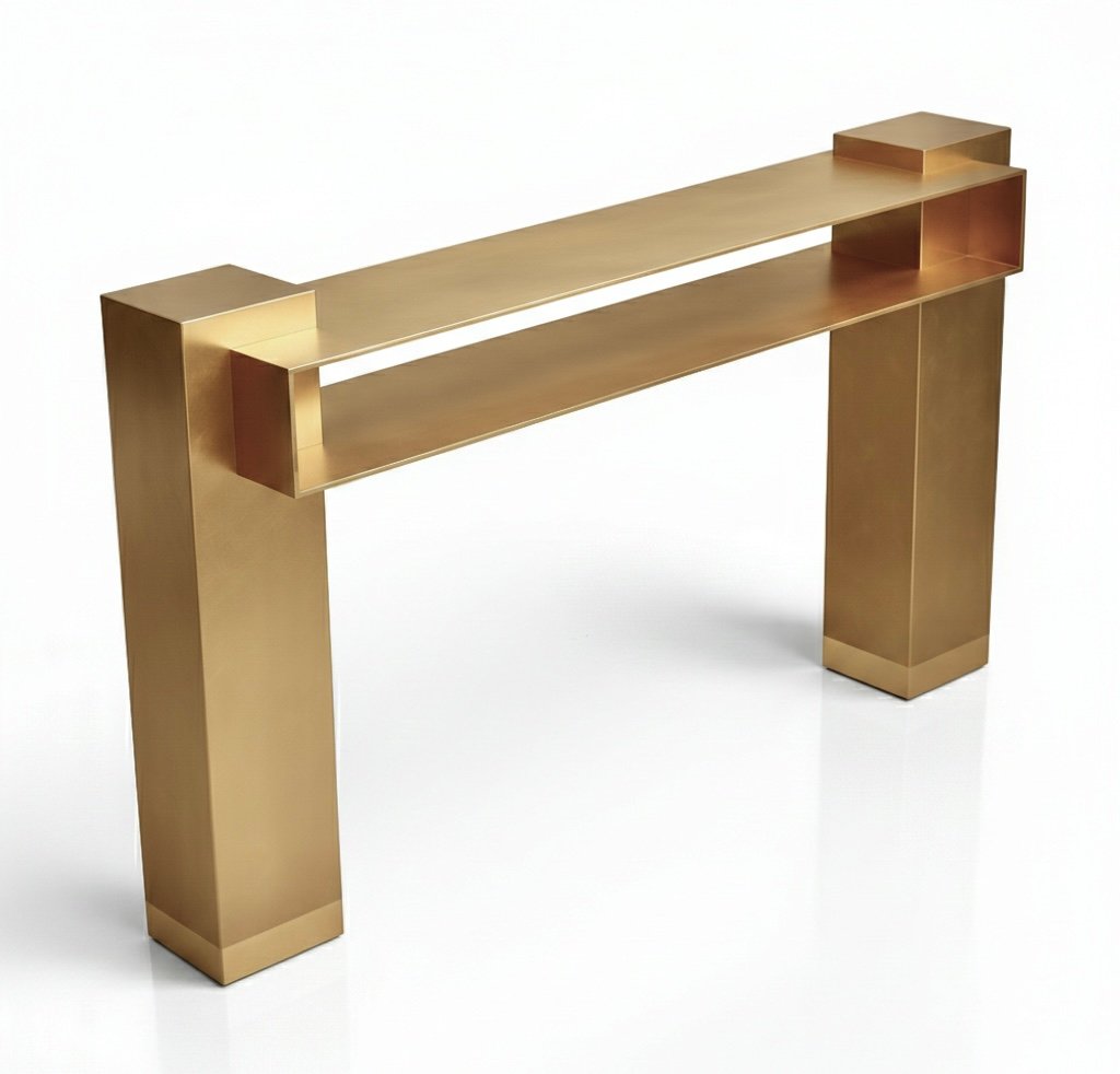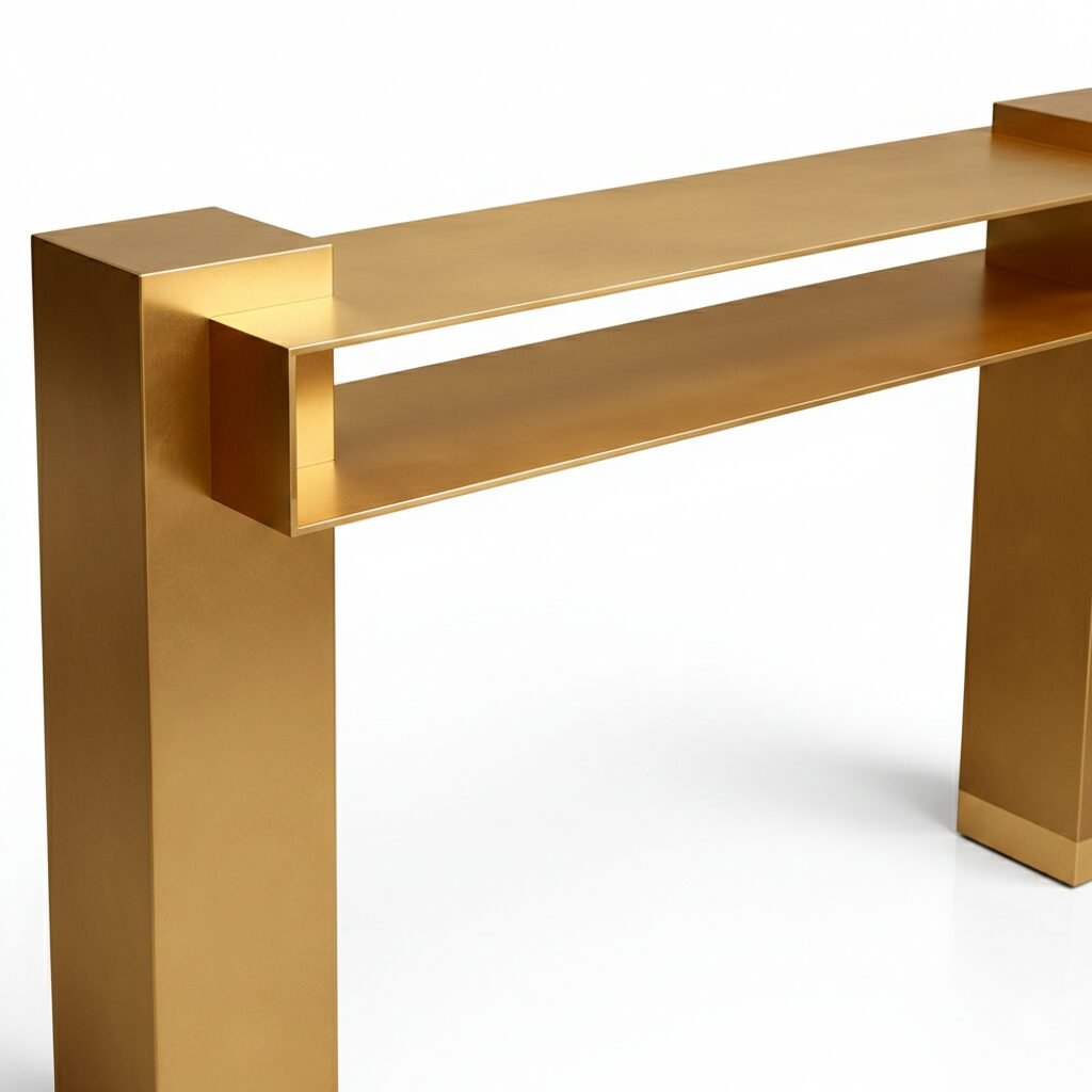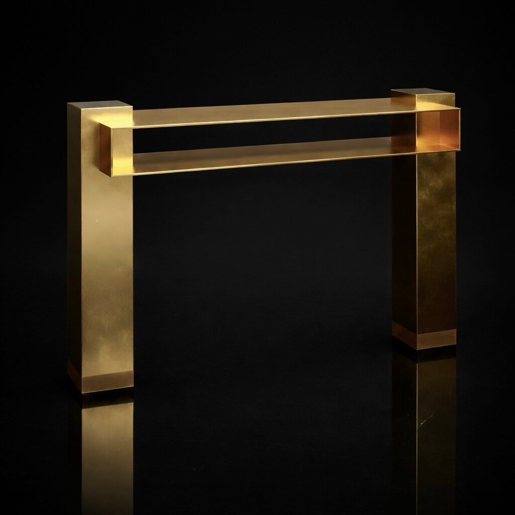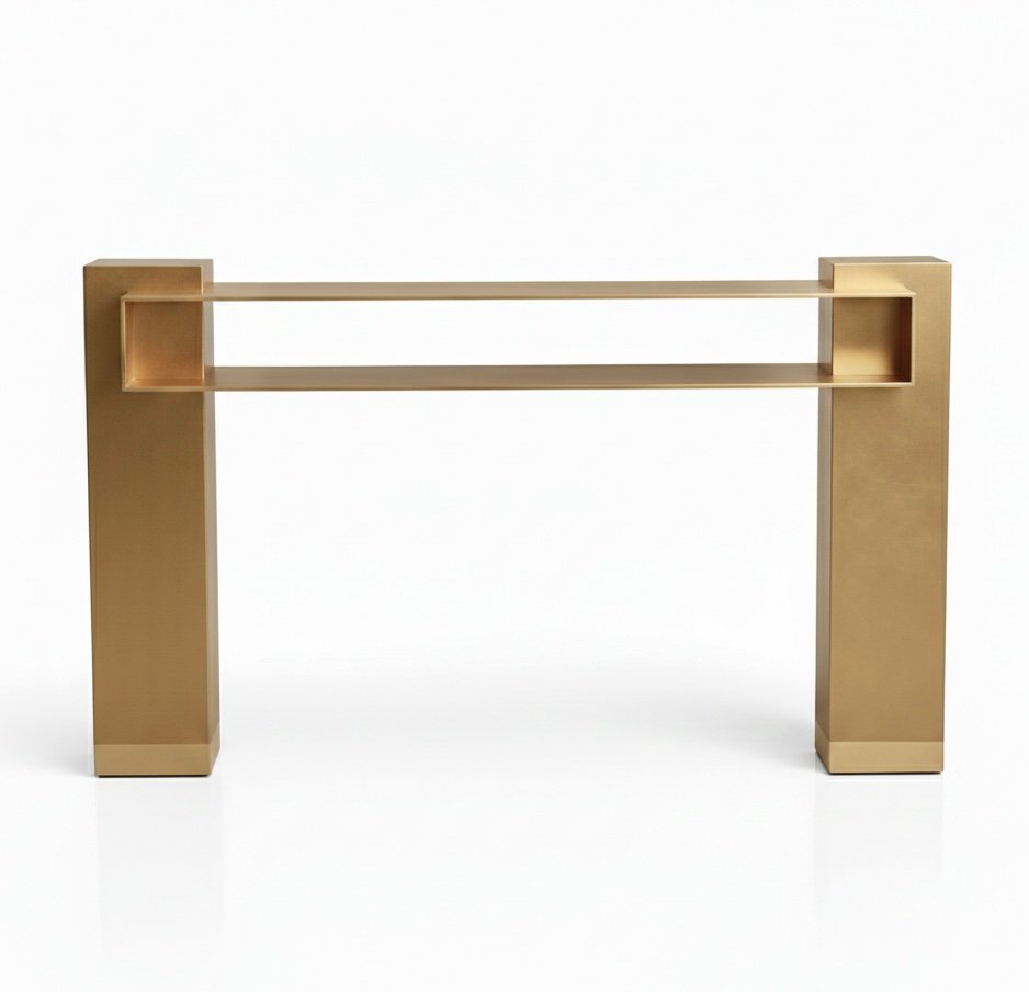 Contemporary console table handcrafted in solid brass, featuring a refined linear design and balanced architectural proportions. The tabletop and lower base are made entirely from solid brass for strength, durability, and long-term stability.