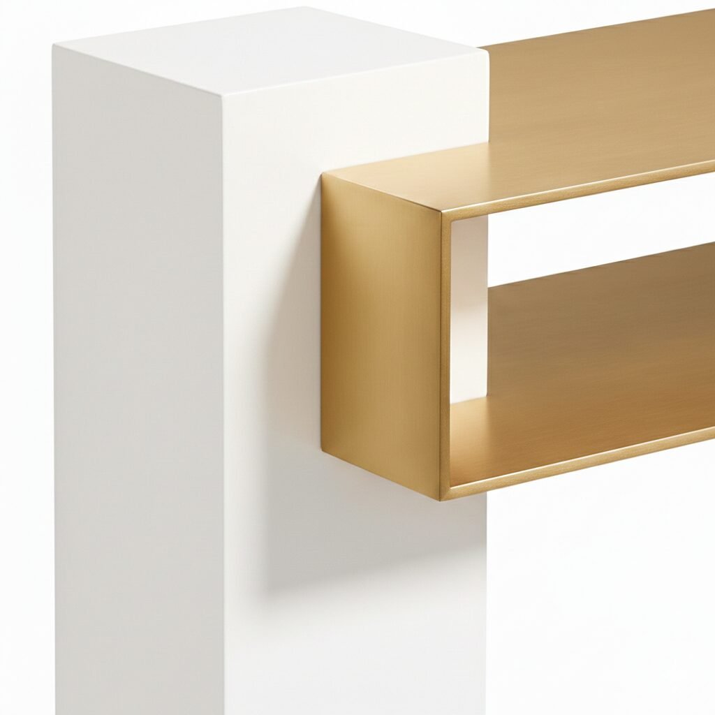 The vertical legs are constructed from natural wood and clad in brass, finished with a white painted coating for added protection and durability. This combination creates a clean architectural contrast while reinforcing the structural integrity of the piece.