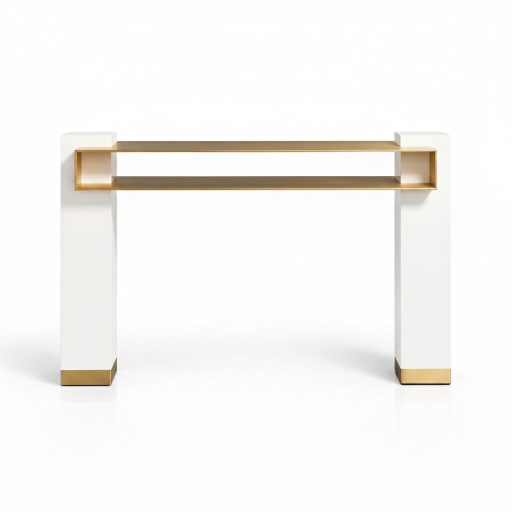 Contemporary console table handcrafted in brass, defined by its refined linear composition and balanced proportions. The tabletop and lower base are crafted in solid brass, ensuring strength, weight stability, and long-term durability.