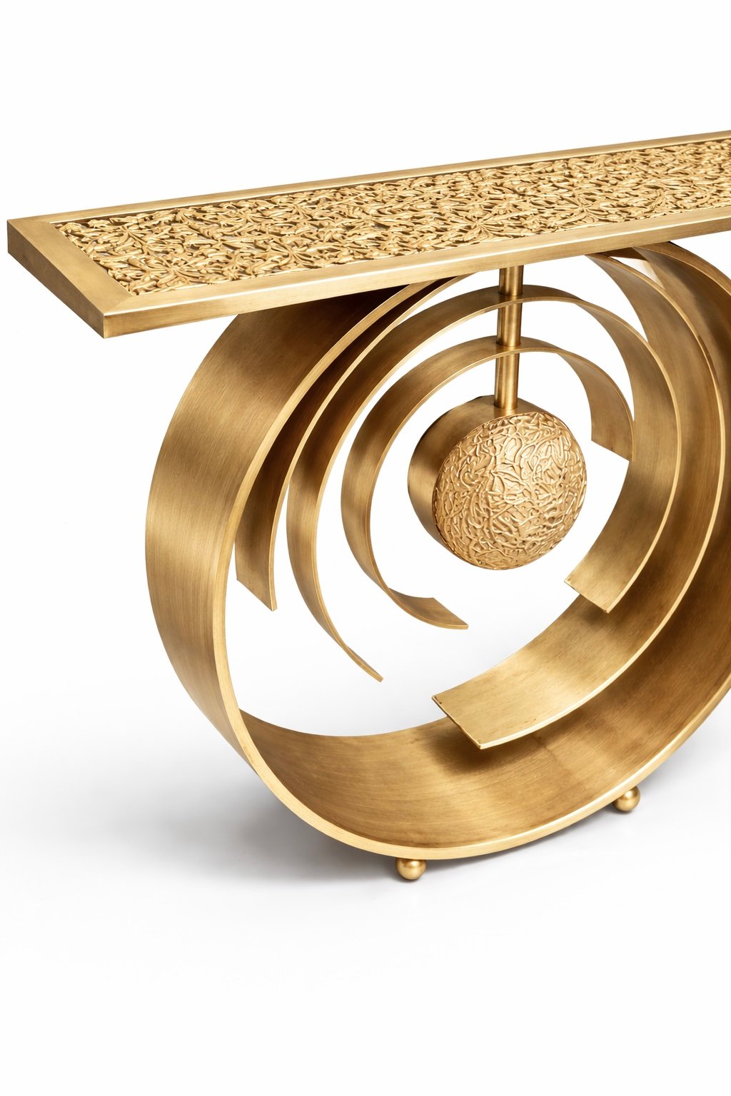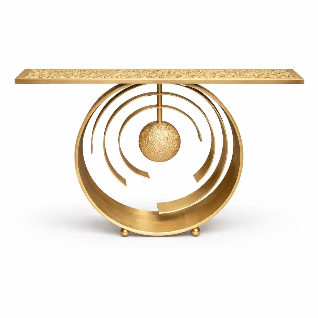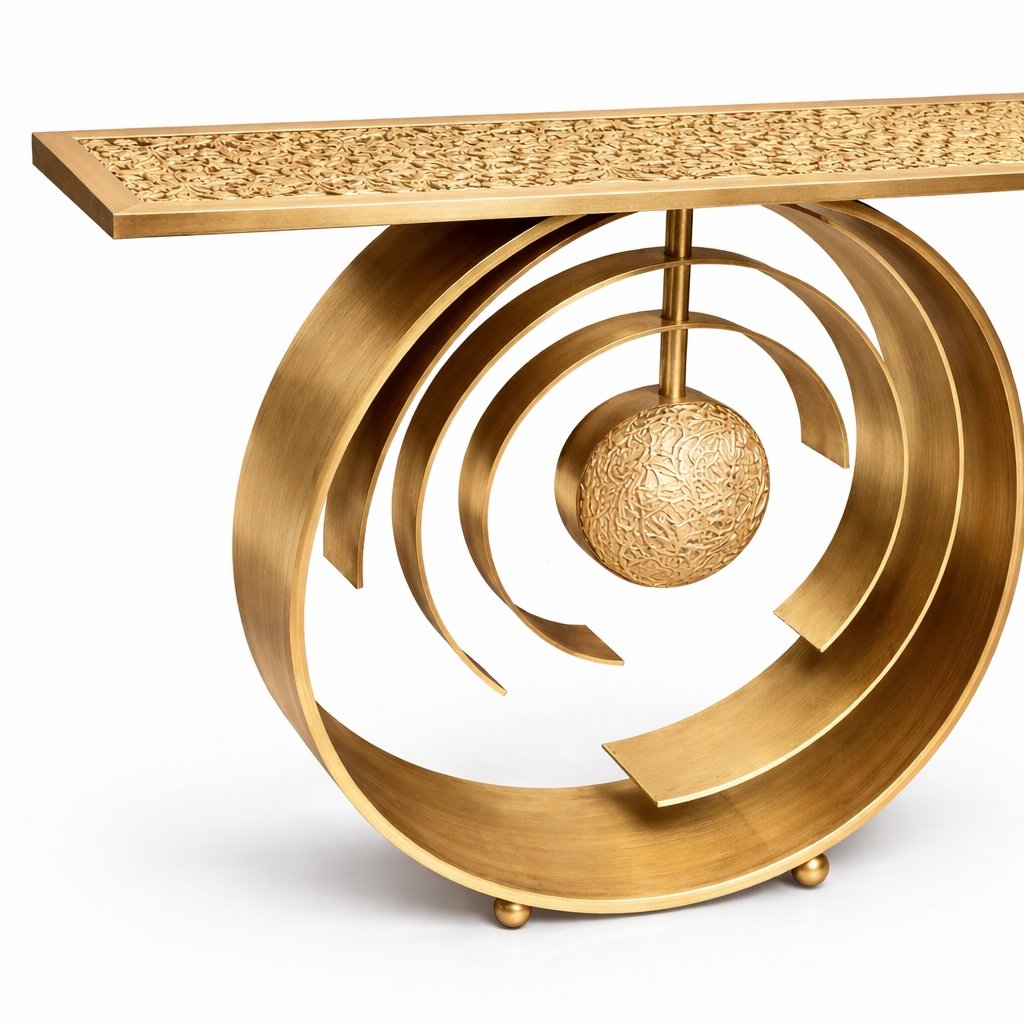 Architectural console table crafted entirely in solid brass. The spiral base creates a sculptural structural form, complemented by a suspended central sphere that adds balance and visual depth.