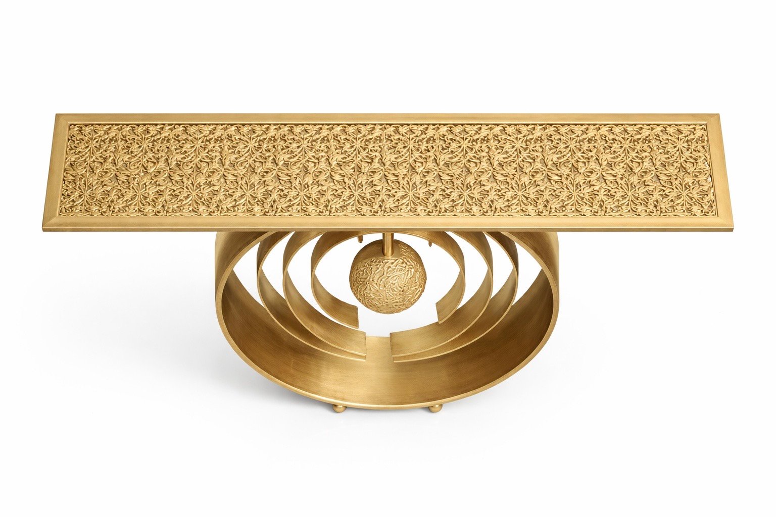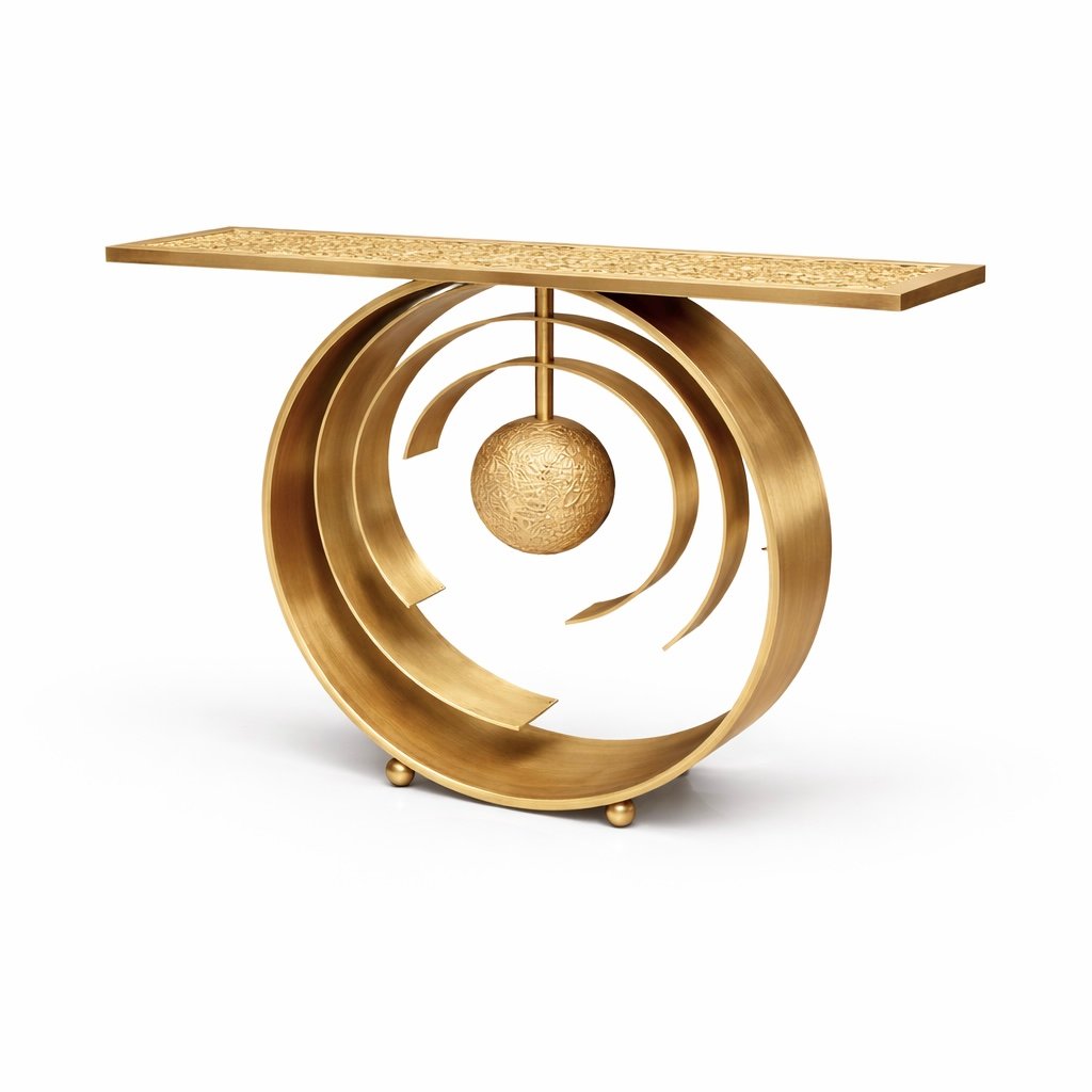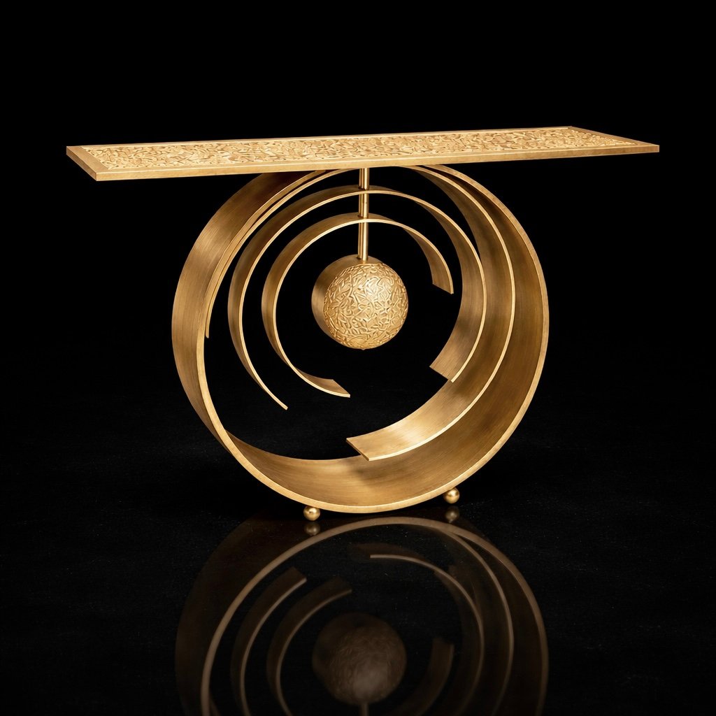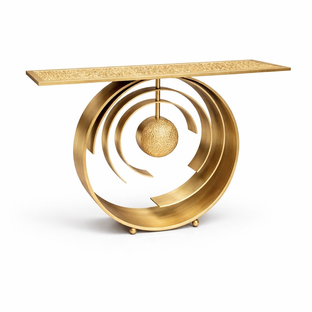Architectural console table crafted entirely in solid brass. The spiral base creates a sculptural structural form, complemented by a suspended central sphere that adds balance and visual depth.