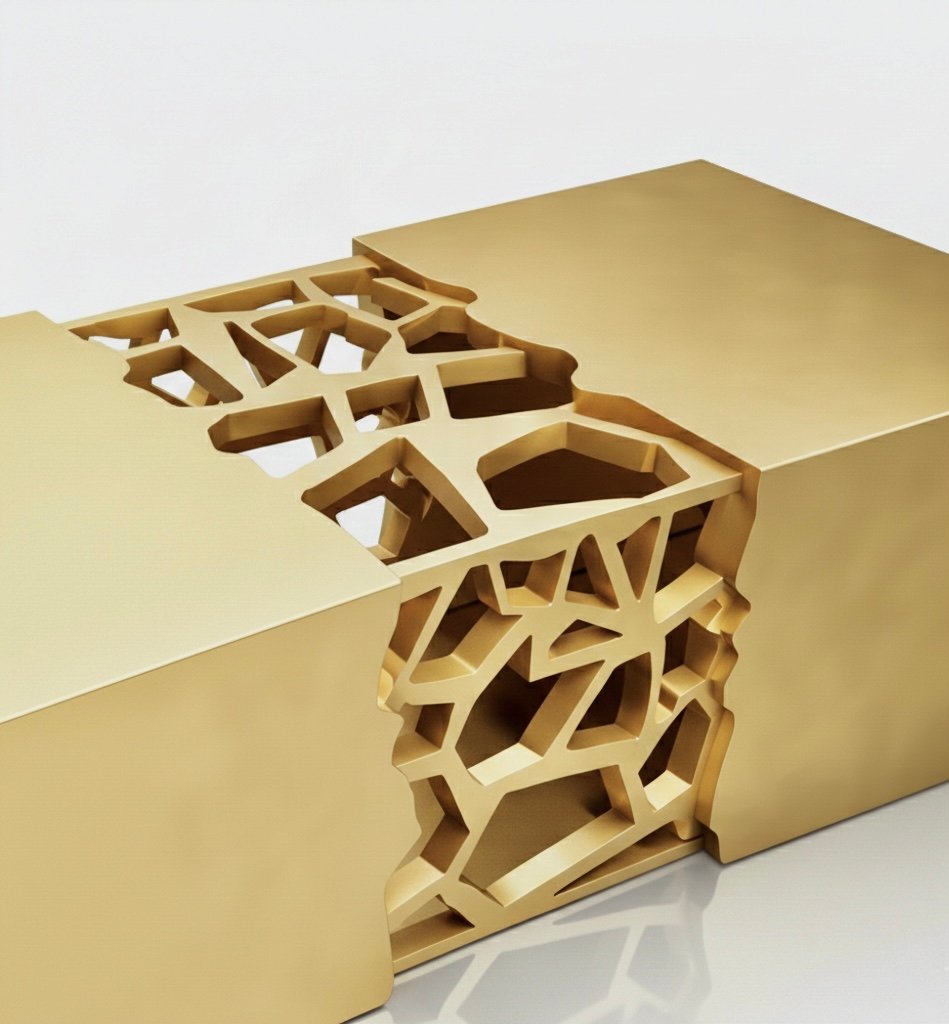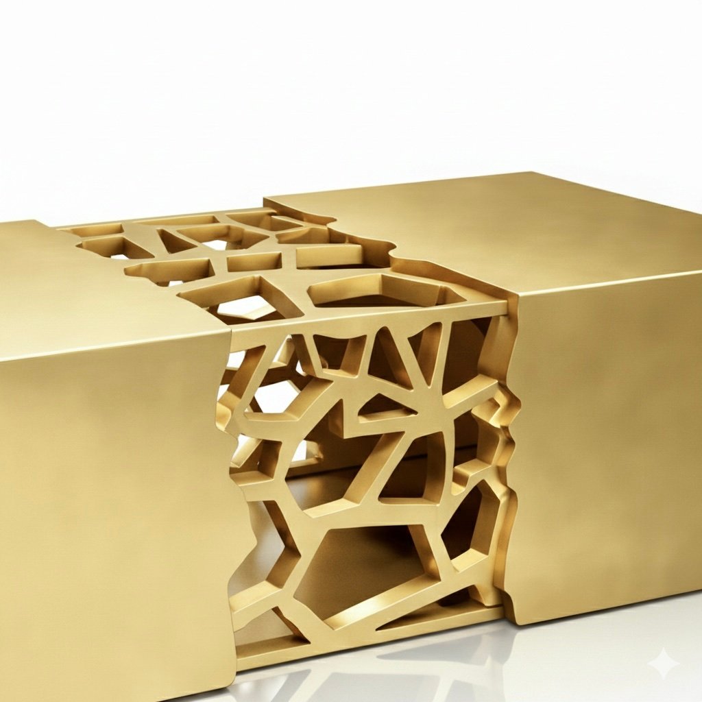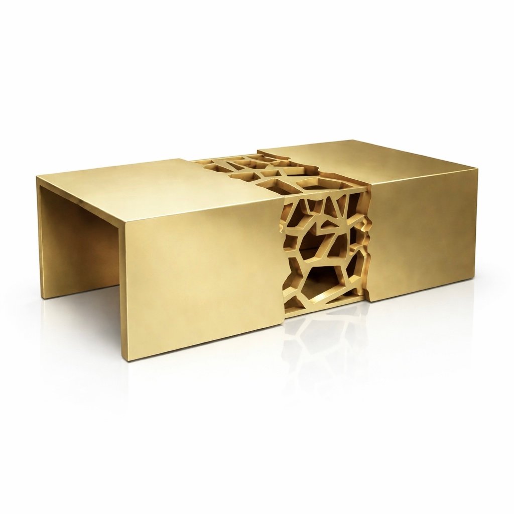 The Modern Sculptural Brass Coffee Table is crafted entirely in brass, expressing material richness through a bold architectural form. Designed as a functional centerpiece, the table combines sculptural presence with refined craftsmanship suited for luxury interiors.