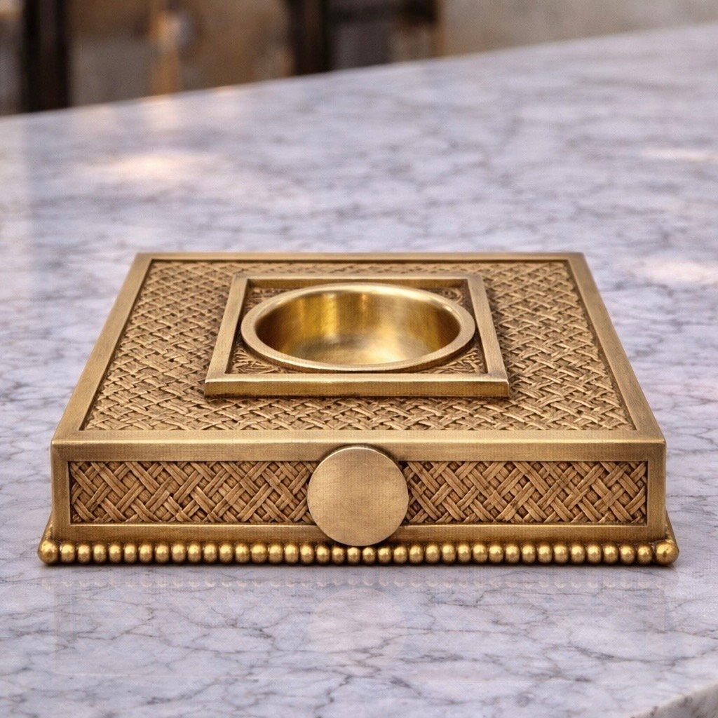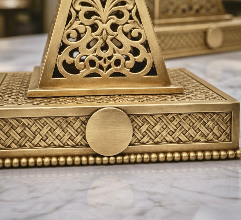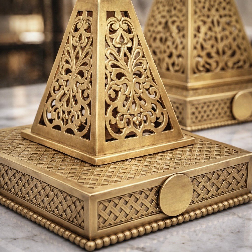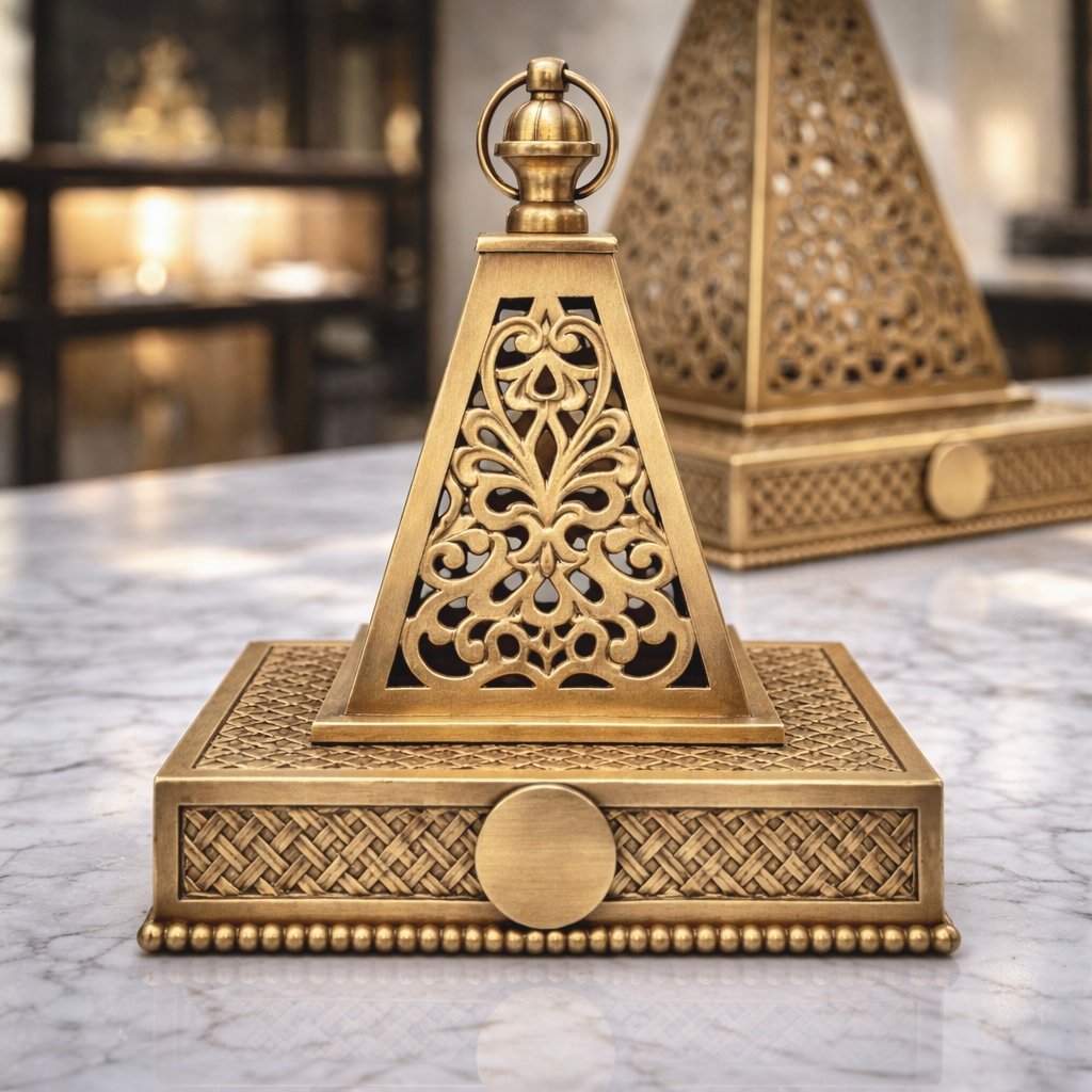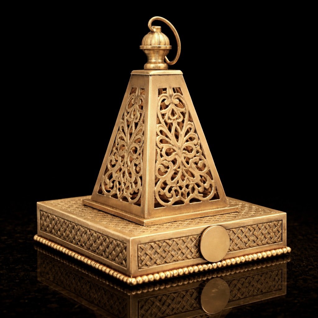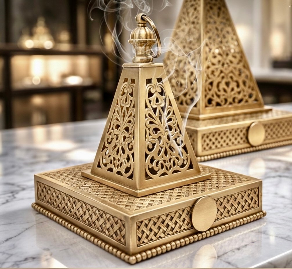 Elevate your interior with this handcrafted Moroccan brass incense holder, designed to burn bakhoor, resin, or incense while adding refined architectural beauty to your space. Made from solid brass and detailed with intricate geometric cutwork, it serves as both a functional burner and a sculptural décor piece.