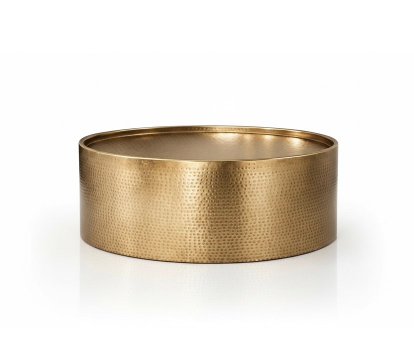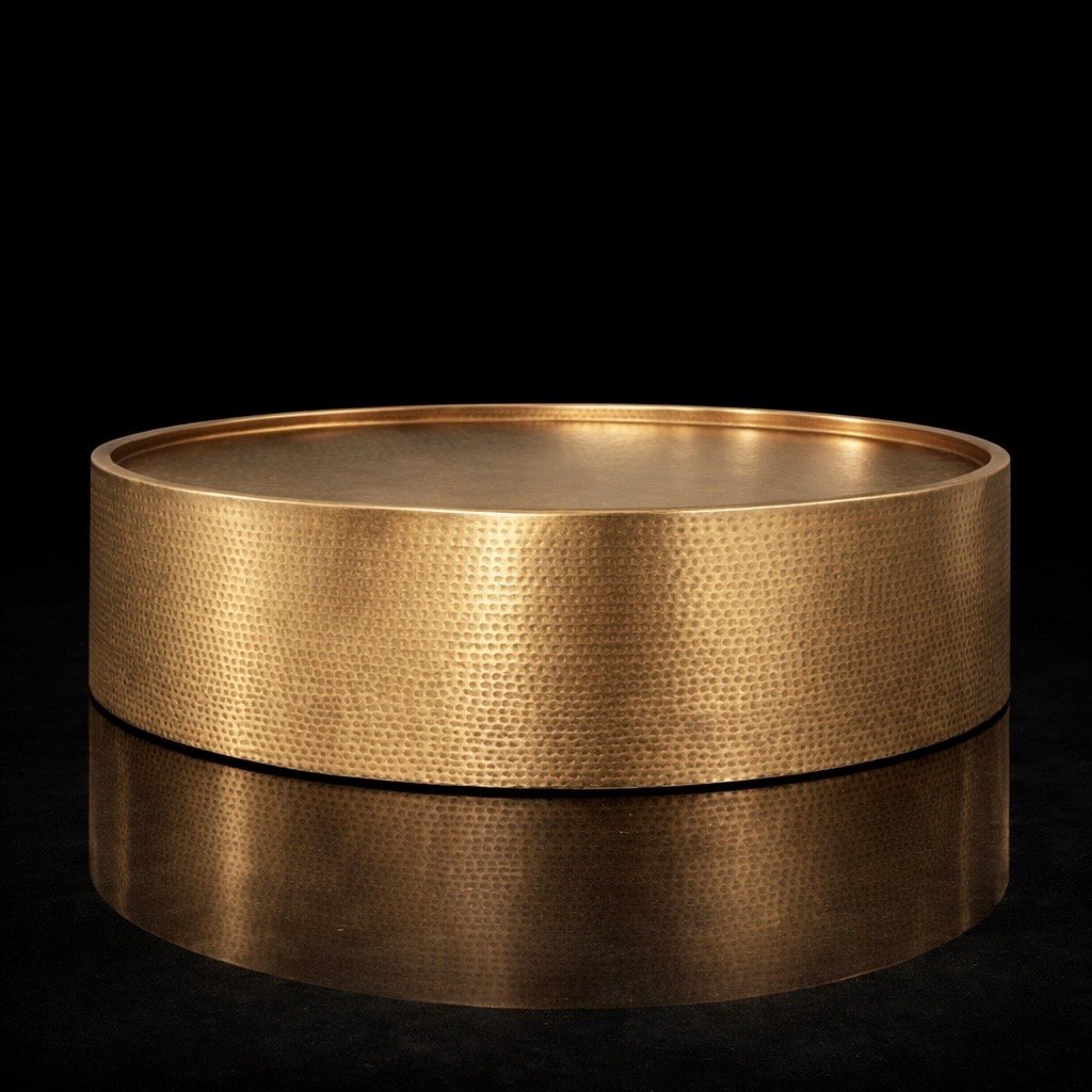 Handmade from solid brass, this round hammered drum coffee table blends sculptural form with timeless materiality. Its hand-hammered texture adds depth, warmth, and artisanal character, catching light beautifully from every angle. The balanced drum silhouette creates a bold yet elegant presence, making it a refined centerpiece for modern and luxury interiors while offering durability and lasting visual impact.