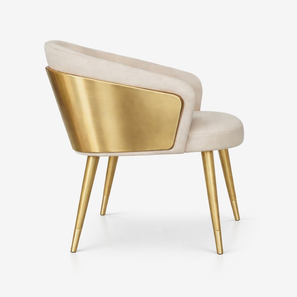 The back features a unique raw brass panel design, giving each chair a distinctive artisanal character.