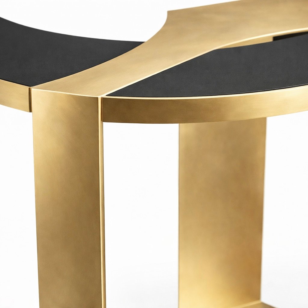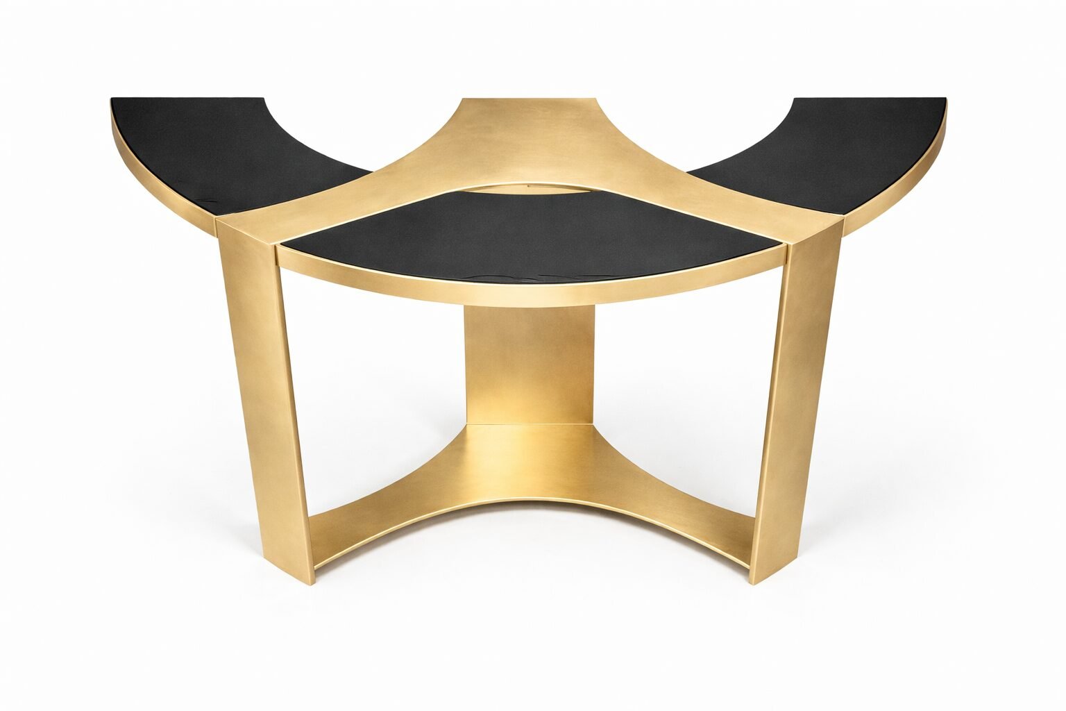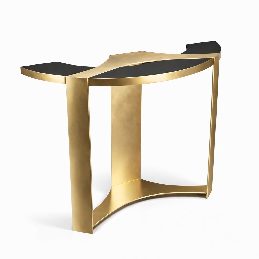 Sculptural console table defined by its fluid asymmetrical form and clean structural geometry. The tabletop features a black tone surface paired with natural brass, while the entire top is crafted from solid brass.