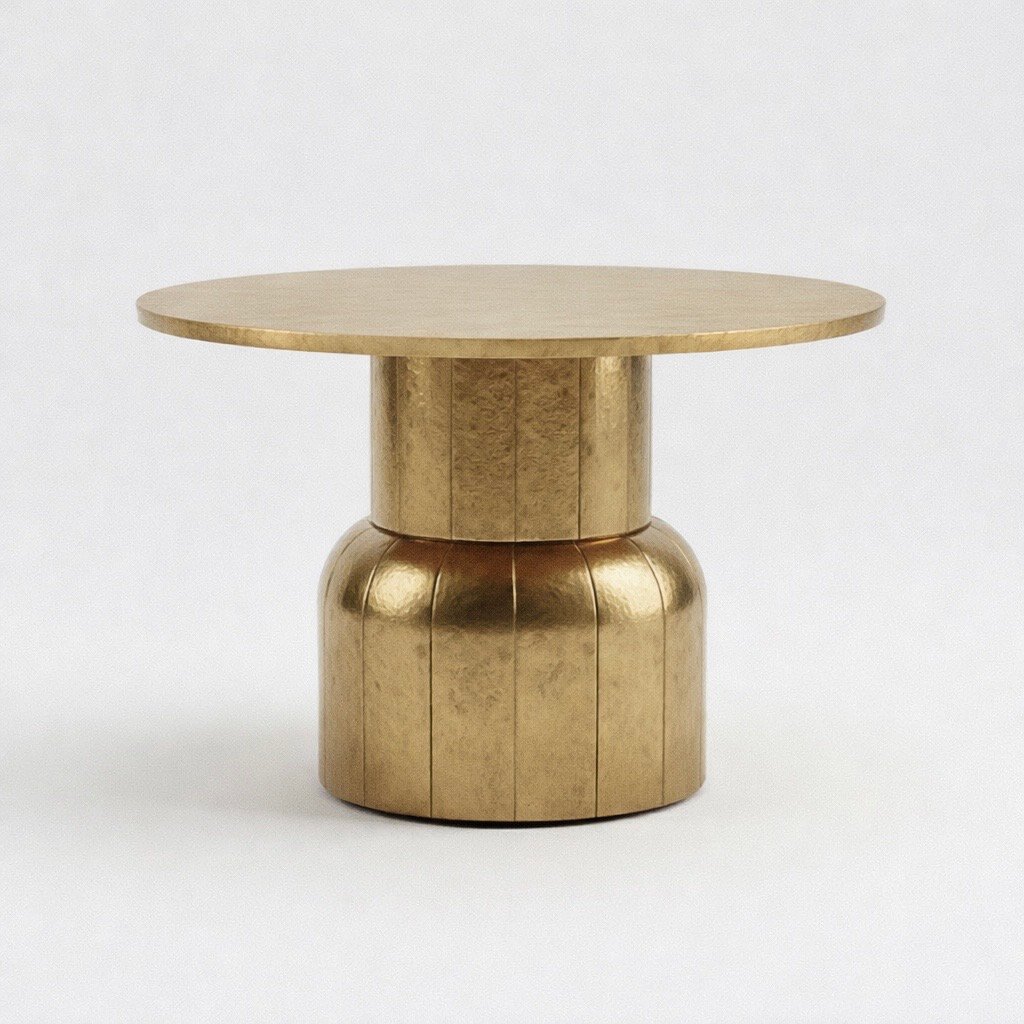 Handmade from solid brass, this sculptural pedestal coffee table features a smooth satin finish and a bold architectural form. The table top is crafted entirely from solid brass, providing weight, durability, and a refined metallic surface that will age beautifully over time.