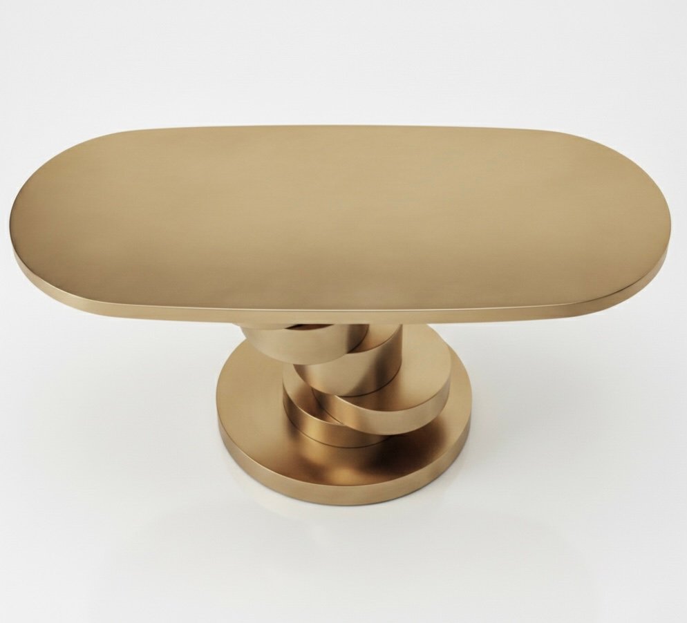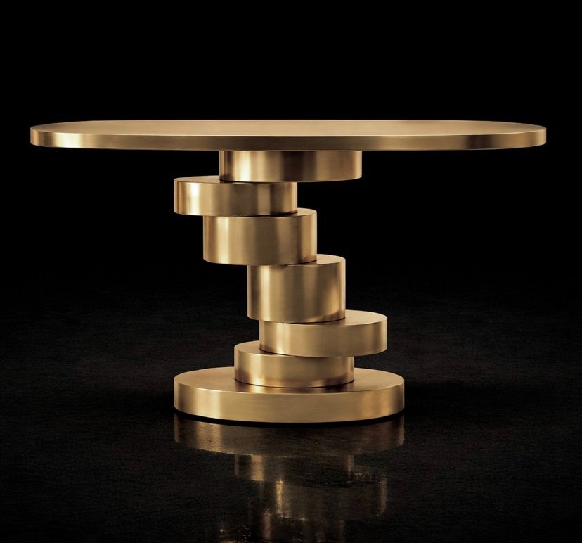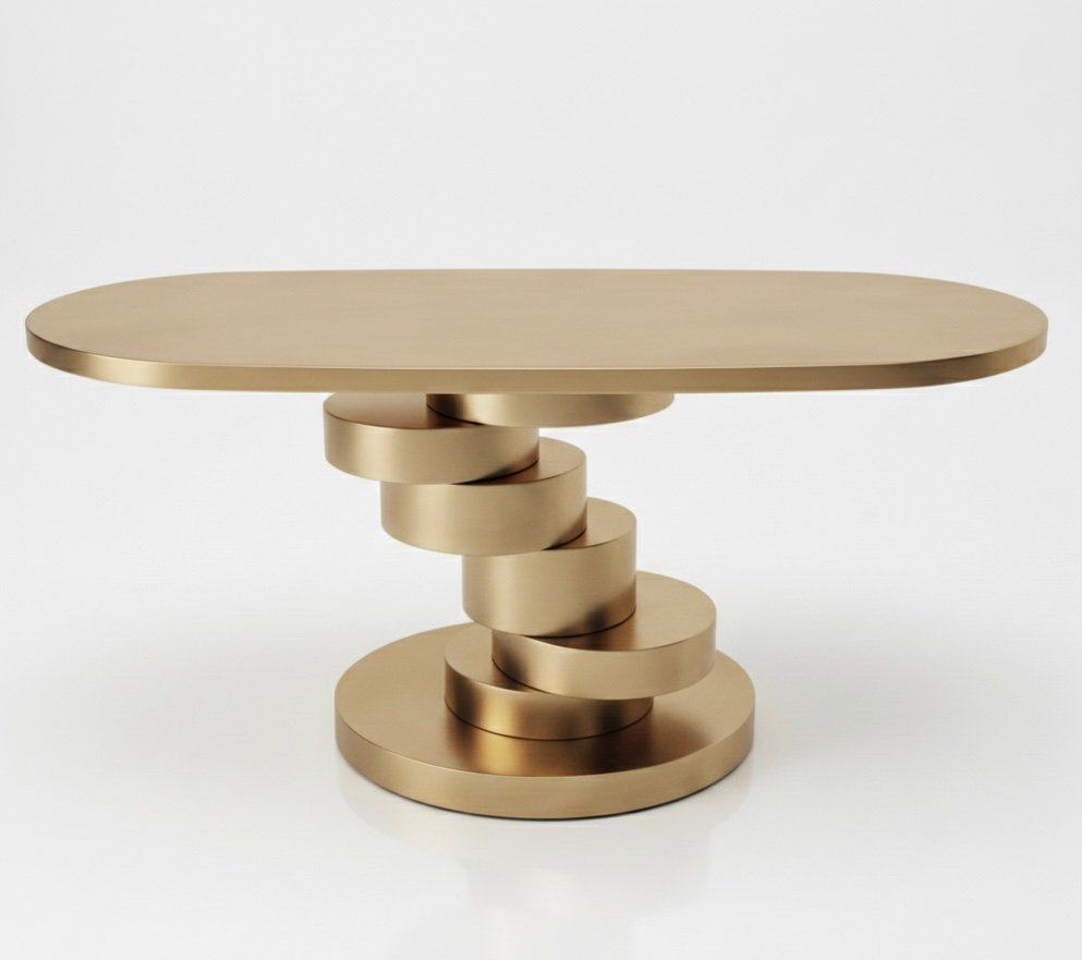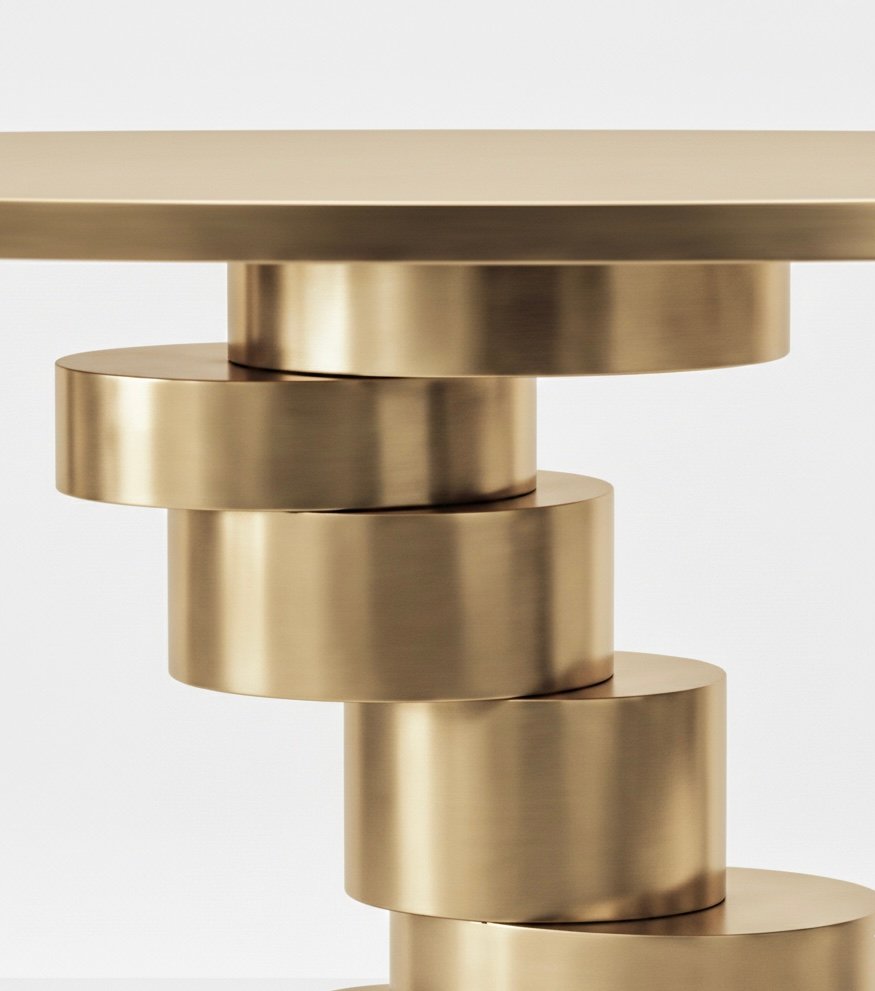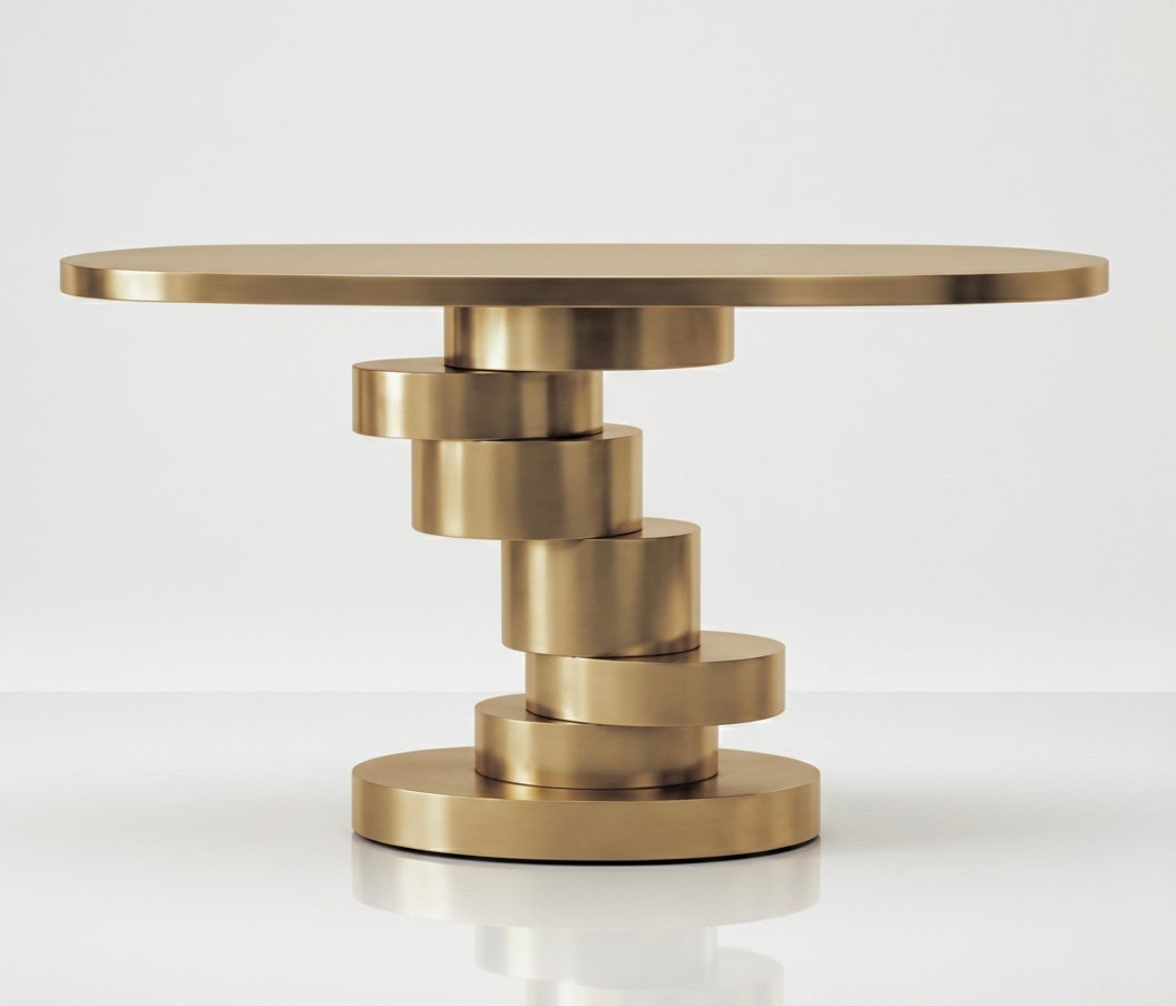 Sculptural console table crafted with a solid brass exterior, defined by its stepped architectural base and refined linear top. The structure is built with an internal wood core and fully clad in solid brass, combining structural reinforcement with a seamless metallic finish.